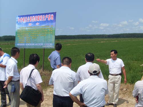 图二为上海外贸商检局郭局长和日本客商们在临海农场考察无公害水稻栽培基地