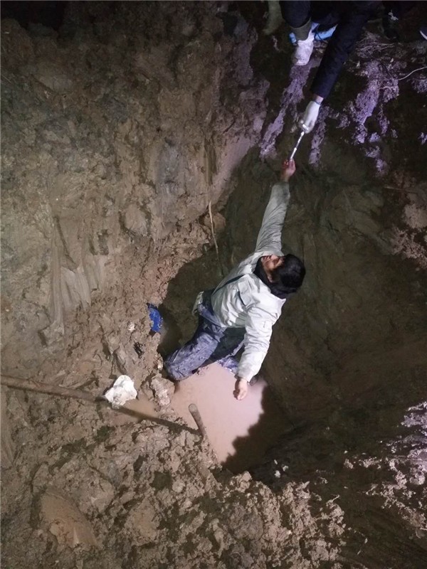 晚上6点30分,水电中心的抢修电话突然响起,位于农场的于沈居民点一条供水管道被冻裂,大面积停水。水电中心主任江尧忠第一反应,“这是一条供水主管网,如果抢修不及时,必定会导致居民生活用水无法正常使用,必须尽快抢修好。”按照制定的应急预案,带着抢修工人冒着严寒立即赶往抢修现场。由于地面冻层比较厚,抢修人员先使用破碎锤将地面破开,把积水排出去,然后使用专用接头把漏水点封住,在最短时间内对漏水管道进行抢修,站在冰冷的水中冻的直打哆嗦,大家都咬牙坚持,经过近3个小时的努力抢修,漏水管线得以修复,恢复了正常供水。