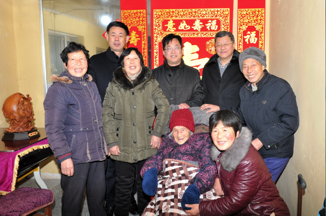 “我们党政工领导来给您拜年了!”王进强一进门就对坐在沙发上的百岁老人说。