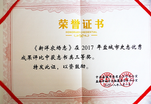 近日,在盐城市委党史工作办公室、地方志编纂委员会办公室开展的2017年盐城市史志优秀成果评选活动中,荣获志书三等奖。