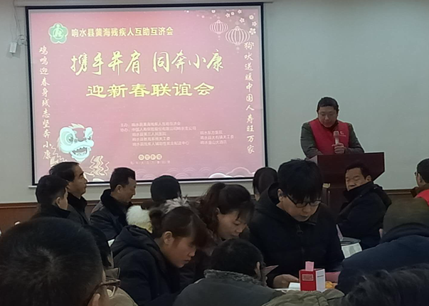 2月7日,“携手并肩 同奔小康---迎新春联谊会”,在响水县金山大酒店隆重举行,响水县黄海残疾人互助互济会会长何颜军致欢迎词,县残联张副理事长发表讲话,关工委潘副秘书长、民政局薛科长等部门领导参加会议,中国人寿保险公司响水县支公司、响水第三人民医院、东方医院等赞助单位代表到场祝贺,县电视台从头到尾跟踪采访报道。