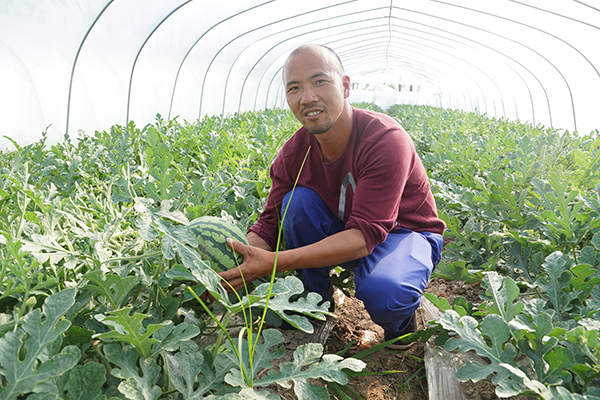 “我们种植的‘麒麟’西瓜今年深受市场欢迎,目前第一茬瓜已与北京客商签订了合同,5月下旬就已上市,第二茬6月份上旬,500亩瓜预计可实现纯收入60万元左右。”承包户王老板说。