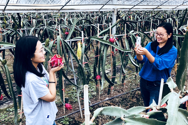 国庆长假,金秋丰收正当时,�港农场新开辟的红心火龙果有机种植基地进入丰收季,个大饱满的果实挂满枝头,惹得八方游客沉醉其间,先尝为快。走进火龙果有机大棚,映入眼帘的是一排排仙人掌似的长茎,茎上挂着一颗颗火红的果子,十分诱人。红绿相间中,不少游人穿梭其中,或驻足挑选,或拍照留恋,欢声笑语,甜透每个人的心田。 游客说,以前我们都是在电视上面看到过火龙果,至于火龙果怎么长的,我们还没看见过,今天一来大开眼界,尝一下,与市场上的口感大不相同,又甜又香。