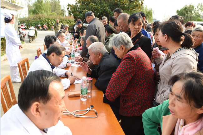 下午2点钟开始,在淮海农场门诊大楼门前,来自扬州大学普外科常见病、多发病和疑难危重疾病的诊治专家,医学博士,外科学教授、主治医师张培健;内分泌科专家教授、主任医师丁立;呼吸内科主任医师蒋有娟;心血管内科副主任医师严俊峰;扬州大学副教授,苏北人民医院中医科主任医师,中医内、儿科专家孙保生;中医科主任医师,骨科专家李宁;心理学副教授王慧和副教授、附属医院神经外科主任医师武永康等8名离退休专家一字排开,端坐在条桌前,拉开了为淮海农场社区的广大职工居民开展义诊活动的帷幕。