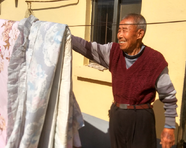 在李朋友家采访过程中,李朋友的女儿李月春告诉我,她父亲也是一个非常爱干净的人,不但家里家外收拾的清清爽爽。只要晴天,天天把被子抱出来晒,并且一直坚持自己的衣服自己洗,从不要儿女掺和。就是睡的被褥自己来勾,换季床铺也是自己来开,样样事做得是像模像样,从来不要儿媳她们来搭半点手。没事时常拿着扫帚帮助一旁儿子们开的农机修理间打扫卫生,就是门前的路上,老人也常拿着扫帚清扫路面,有时还向两边打扫出去有百十米长,让负责这片的环卫工都要感谢他。
