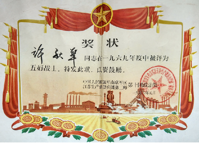 “听说淮海筹建的农建四师暨淮海农场历史陈列馆有知青这方面的资料馆,我特地把这份珍藏已久的上山下乡期间获得的奖状和致家长同志们的一封信捐献给陈列馆,让大家一起铭记那个年代峥嵘的革命岁月!”近日,无锡知青许秋华特地请人把奖状和印有最高指示的一封信请人转交给了农建四师二期工程建设陈列馆的工作人员手中,望着这颇有历史厚重感的实物,好似令人重新回到了那段难忘的岁月。