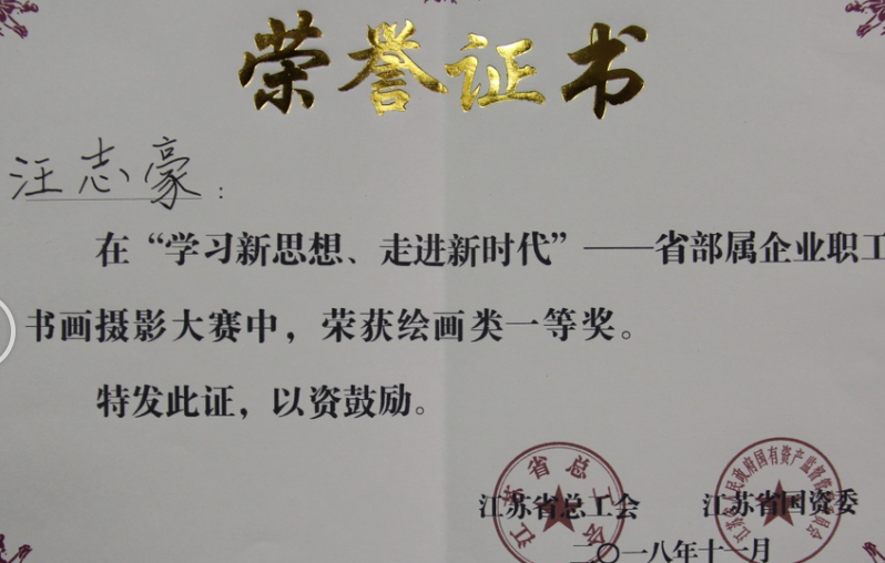 日前,由江苏省总工会、江苏省国资委联合主办的“学习新思想、走进新时代”——省部属企业纪念改革开放四十周年职工书画摄影大赛颁奖和优秀作品展开展仪式在南京紫金文创园举行。黄海职工汪志豪绘画作品《绿云浮影生紫烟》荣获绘画类一等奖 。