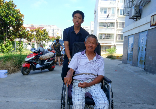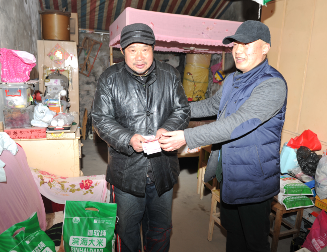 图为一名不愿透露姓名的个体老板捐助1000元现金和2袋大米给贫困职工严建明