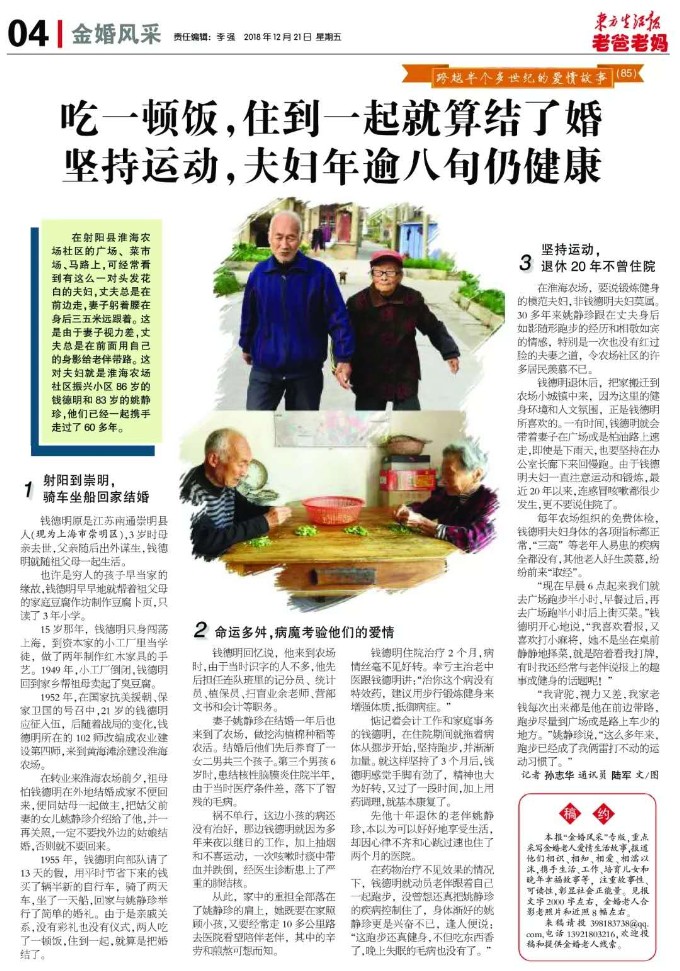 在12月21日出版的东方生活报第4版《跨越半个多世纪的爱情故事》专栏上,刊登了一篇淮海农场宣传科科长陆军采写的《吃一顿饭,住到一起就算结了婚 坚持运到,夫妇年逾八旬仍健康》的文章。从钱德明和姚静珍结婚写起,到婚后相濡以沫的生活,再到老人如今通过坚持锻炼,保持健康的体魄为中心来写。文章读后令人感动。自去年陆军开始写金婚故事以来,已在报上刊登了 9篇金婚故事和 7篇整版人物专稿。以下是全文内容。