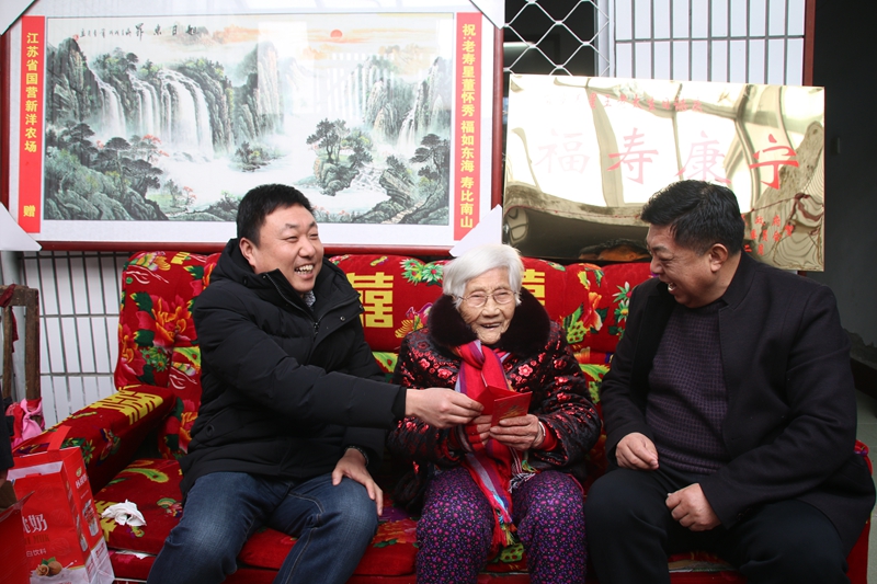 山中难寻千年树,世上难得百岁人。2月15日,董怀秀老人喜迎百岁寿辰。当天,新洋农场有限公司副总经理王煜明以及射阳县民政局主任杨为宏等一行共同前往老人家中为老人祝寿,分别送上慰问金和牌匾,真心祝愿老人福寿安康。