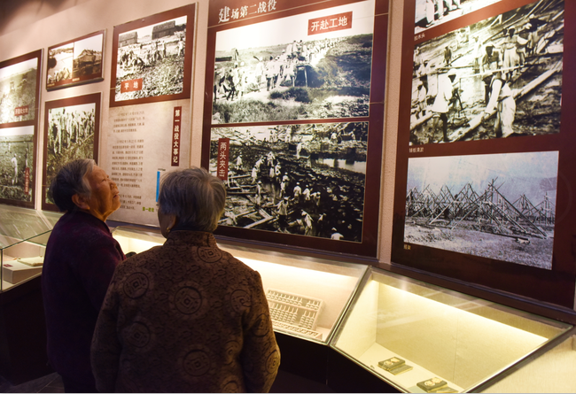 “这个人叫某某某,那个人是张某某,你看他们笑得多开心啊!”只见两位老人在陈列馆中不时地驻足观看展墙上的照片,不时地指指点点,看得出她们很认真,一幕幕照片的生产场景,仿佛把她俩又带进了建场初期的战斗场景。