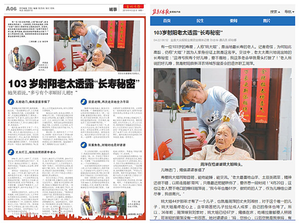 这是一个四世同堂的大家庭,报纸中的百岁老人名叫“姚大姐”,今年103岁高龄,耳聪目明,能吃能睡,能交流,见人就爱讲述她的长寿秘密:“这得亏我有个好儿媳,要不是她,我这条老命早就骨头打鼓了!”