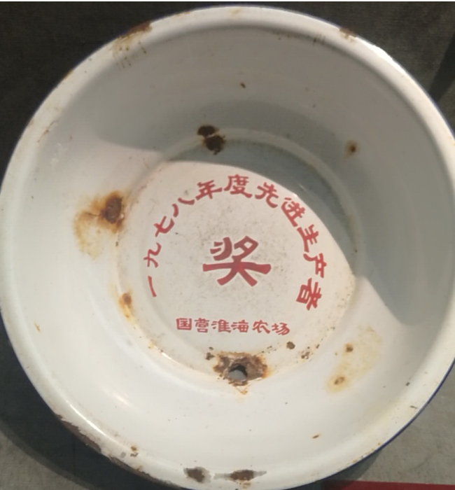 据了解,这只洗脸盆的主人是无锡知青朱正才1978年在国营淮海农场红旗分场十四连试验班当班长时,在年终通过层层评选,最张获得先进生产者所得来的荣誉。据悉,朱正才在淮海农场兵团期间,就得到过3只同样的洗脸盆,其他2只在使用过程中,一直用旧了破了才扔掉。而这只脸盆因为还没有使用时,1979年3月就回城了。想起从学校毕业就来到了淮海农场,并在这片土地上战天斗地的10年岁月,把最好的青春岁月都留在了淮海农场,现在回城了也没有什么有值得纪念意义的东西,所以这只没有用过的洗脸盆就被夫妻俩给珍藏了起来。