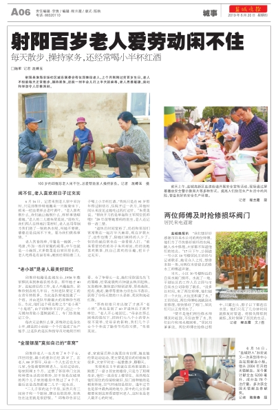 在6月20日出版的盐城晚报城事栏目上,一条以超出半版篇幅的《射阳百岁老人爱劳动闲不住》的人物新闻显著亮相六版的关条上,当淮海百岁老人邱维珍拿到写有自己报道的报纸时,开心地说:“没有想到我的寻常生活也能刊登在报纸上,太高兴了!”说完,边看着报纸上自己和家人的照片,边举起大拇指夸赞着。