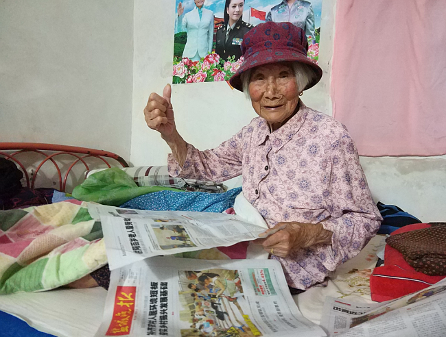朱荣美在5年前就在农场渠星路上购置了一套2居室的楼房,只是为了照顾母亲,他们一直没有上楼居住。虽然现在他们居住的房屋较破旧,但门前种植的是稻麦林地,空气环境却是很好。逢年过节也是家中最热闹的地方,家中的儿女孙辈都要来到这里看望慰问老人,这时也是老人最开心的时刻。图为邱维珍老人在文章中刊登的照片和老人拿起报纸欣喜的镜头。