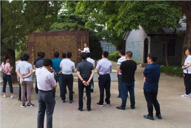 6月28日,在农建四师大院内一座大理石碑前,农建四师陈列馆讲解员王超男正在给来这里进行红色传统和廉政文化教育的建湖县委组织部部机关的人员讲解军委主席毛泽东向102师全体指战员签署“生产待命、建设农场”的碑文。