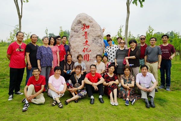 老知青们以知青文化园的石碑为背景集体留影后分别还单独留影。