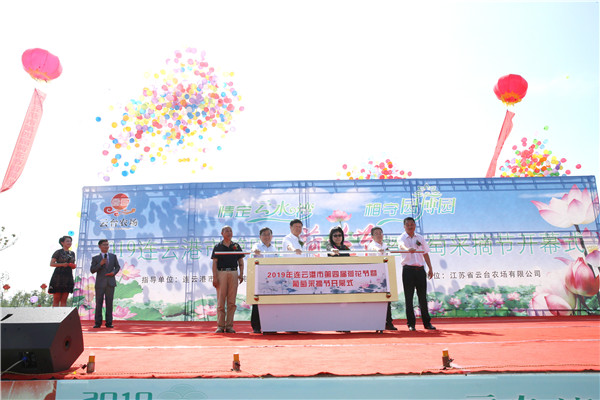 连云港市副市长陈书军宣布连云港市第四届荷花节开幕,并与省农垦集团总会计师刘克英、高新区党工委书记陈佑龙、市文化广电和旅游局副局长柏银枝、市自然资源和规划局局长孔令泰、农场公司党委书记刘卫华共同为开幕式推动启动杆,第四届连云港市荷花节正式开幕。