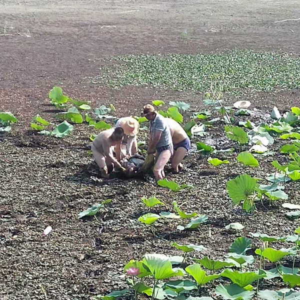 由于近期持续干旱无雨导致洪泽湖水位急剧下降,为了保证水稻秧田夏管用水,7月25日上午,三河分公司领导组织分公司总经理助理金见国、农水中心彭中进、第一、第二生产区负责人屈连成、李孝刚、分公司副总农艺师贾后如一行六人前往三河农水中心彭中进、第一、第二生产区主任屈连成、李孝刚、工程施工负责人孙树华一行六人前往新丰站勘查引水现场。当行至新丰站一千米左右时,发现离岸边几十米的荷花荡内有一人站在淤泥里,他们原以为是在采莲藕,便开玩笑的说,藕好不好吃啊?这时候,那人抬了一下头微弱的说了一句,“快点、我要死了”,说完这句话,那人便一头栽倒在淤泥里,不好,那人肯定是陷进淤泥上不来了,说时迟,那时快,李孝刚、孙树华迅速跳进淤泥,向那人艰难的䠀去,随即分公司总经理助理金见国、农业中心主任贾后如也迅速跳入淤泥中,四个力合力用采摘莲子的袋子将那人兜住,拼命的往上拖。而这时在岸边的屈连成、彭中进正焦急的打110和120,当得知陷在淤泥里的是位七十多岁的老人并已经中度昏迷时,心想,不行,等120赶到就来不及了,赶紧联系农场医院就近进行抢救,一场与时间赛跑的“抢救战”在洪泽湖边大堤上上演。老人救上岸后由于严重脱水一直昏迷不醒,分公司总经理助理金见国迅速组织大家给老人脱去满是淤泥的衣服和鞋子给老人散热、喂水,农场医院接到求救的电话后,迅速派出医护人员携带着急救药品往出事地点赶去,由于通往老人出事的地点车辆无法驶入,护士严梦怡下车后一路“狂奔”以最快的速度冲向洪泽湖边,到跑到老人出事地点时,护士服已经全部湿透了,顾不得喘口气,迅速给老人进行输液急救,当120救护车赶到时,老人已恢复意识并清醒。