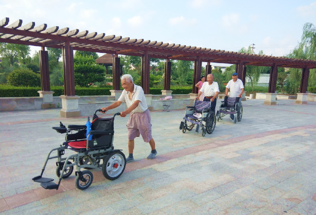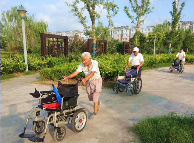 “我们每天坐在轮椅上来公园看看风景、聊聊天,生活也是很充实。当然了,推着轮椅车在公园里转圈赛跑,也是我们自我加强体能锻炼的一种活法,这样的生活我们这些老头都是感到很惬意。”三位老人一致地表述着。