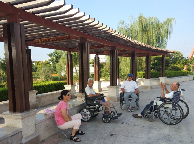 “现在生活条件好了,淮海公园中的环境和设施让残疾人也有了运动之地,我们几个八九十岁的老人虽然腿脚不便,但大家有共同语言,每天在公园内玩得很好,还一起相互鼓励进行环公园轮椅赛哩!”在淮海公园的长廊下,行走不便的朱大爷坐在轮椅车上很是兴奋,志趣相投的三位老人聊天结束后,就会来一场“说走就走”的步行赛,虽然朱大爷坐的是一辆电动的轮椅车,但他还是与他们一起,徒步推着残疾车向前奔跑。