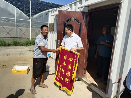 8月19日上午,家住灌云县图河镇官场村的特困农户林树其,来到由苏垦农发云台分公司实施兴建的江苏农垦产业帮扶图河豆丹养殖基地,向分公司总经理宋光锋献上写有“心系图河 情牵特困”字样的锦旗,表达他对基地今年以来无私传授豆丹养殖技术,帮扶他一年实现脱贫致富的感激之情。