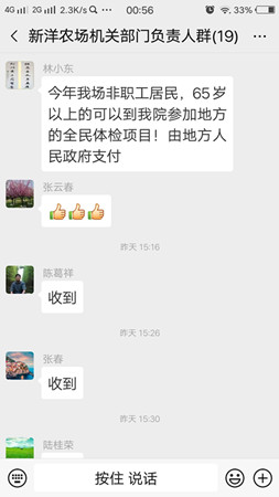 9月10日中午,新洋农场医院院长林小东在公司负责人群里分享了一则喜讯,“今年我场非职工居民,65岁以上的可以到农场医院参加地方的全民体检项目,由地方人民政府支付。”标志着经过一年多的积极对接,农场公司终于争取到部分人员全民健康体检均等惠民政策,提高了居民群众的幸福感和满意度。消息传出后,在全场范围内起了很大反响。