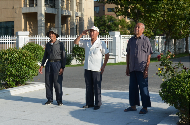 9月12日下午,谢开平、于明生、胡铁成等三名屯垦戍边的老人相约来到了农建四师暨淮海农场历史陈列馆,依次参观了农建四师纪念碑、毛泽东主席命令碑文和农建四师陈列馆,他们在参观时相互搀扶着进行参观叙说着曾经的过往。在农建四师纪念碑前,88岁谢开平老兵以立正姿态,庄严地举起右手向农建四师纪念碑行军礼良久。