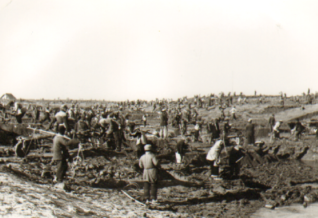 队伍出发了!迎着雨,顶着风,踏着泥泞的道路奔赴工地,到达目的地后,同志们立即就在风雨中与黄土“开火”!雨越下越大,风越刮越凶,每个同志从头发到脚跟都被雨淋湿了,淤泥粘住锹头,地下水位很高,挖一块泥很吃力。虽然,有水车可车水,面盆可戽水,但是沟底的水老是渗出来!战士们把淤泥从河底向岸上扔,力气小的扔得近,又从坡子旁滚回沟里,这些困难吓不倒英勇的人民战士。图为当年农建四师官兵在水利工地上战斗的镜头。