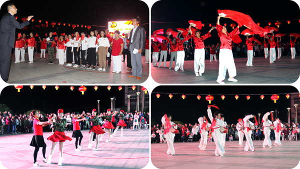 咚呛,咚呛,咚咚呛……铿锵的腰鼓打起来,红红的彩绸飘起来,欢乐的节拍动起来。舞蹈《红梅赞》、合唱《我和我的祖国》、独唱《再唱山歌给党听》、诗朗诵《美丽的家乡——�港农场》、传统太极表演、欢快的广场舞……职工居民用饱满的热情、优美的舞姿、动人的旋律、真挚的感情表达出对伟大祖国的歌颂与赞美之情,赢得了全场观众掌声不断,大家的脸上都洋溢着节日的幸福微笑。