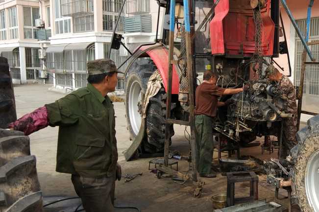 今年“三秋”开始以来,为保障农机更好地服务农业,该农机修理所以提供配件和抢抓修理为主业,既上门或到田间地头进行抢修,又接受广大农机户上门修理农机业务,同时也无偿地为广大农机户提供技术咨询、电话医生等服务,以站在农机户的角度上思考问题,尽可能地缩短农机手等待农机配件或是修理的时间,千方百计并加班加点地为广大农机户提供方便。为节约时间,他们的中晚餐全交由快餐店来经营,夜晚更是加班加点地挥汗如雨抢赶进度。他们正是以诚信经营的理念和优质的服务质量,受到了农场有限公司及周边广大农机户的支持和欢迎。图为李贵等四兄弟在抢修农机时的镜头。