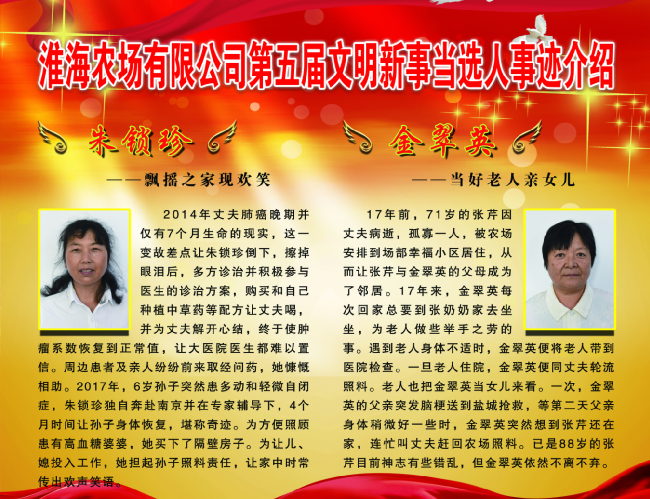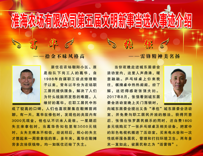 走进淮海农场有限公司机关大门,西侧橱窗上6名文明新事的先进典型赫然在目,细读带有他们头像标志的文明新事事迹,让人不仅产生了发自内心的感动。自今年第五届文明新事在农场公司的第十三届广场文化节上表彰以来,做文明人,践文明事,已经成为了农场公司职工居民的新追求。而举荐和表彰文明新事活动,既是农场公司开展“不忘初心、牢记使命”主题教育的一项重要内容,也是全淮海上下学习先锋先进、激发使命担当的一项重要举措。