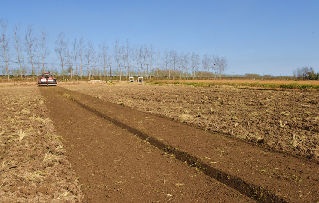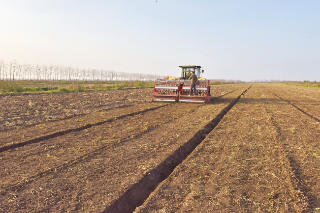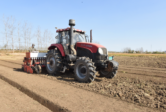 这种集多功能作业于一体,不但减少了多道农机作业对土壤的镇压破坏,保持了土壤疏松的状态,而且通过不同深度正反双轴作业,成功解决了土块过大、土壤潮湿和地面不平的难题,使播种质量大幅度地提高。经过对比,不但使农机的机械作业费降20元的基础上,还与常规机械相比要省10多斤种子。特别是在抢种抢播的情况下,使用新型机械播种,水稻茬耕翻后就能连续进行开沟平整播种作业,不但增强了小麦的抗逆栽培能力,还为抢得农时和赢得冬前积温奠定了基础。图为淮海自主研制的复式机械在开沟平整播种一体化作业时的镜头。