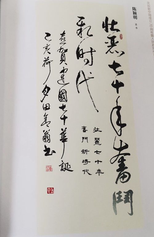 陈颖明的草书《壮丽七十年 奋斗新时代》、陈兰的草书《祖国万岁》、朱玉兵的楷书《风雨同舟七十年》以及张秀亭的画作《长城雄风》、赵文谨的画作《硕果满园》均得到了高度评价,成功入选书画摄影作品集。