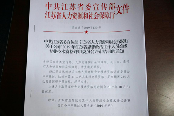 近日,中共江苏省委宣传部、江苏省人力资源和社会保障厅发文,在2019年度江苏省思想政治工作人员高级专业技术资格评审中,31人获研究员资格,224人获副研究员资格。江苏农垦系统四人获得副研究员资格,分别是海安农场有限公司崔静波、南通有限公司薛忠、江心沙农场有限公司严建文和新洋农场有限公司陈必春。