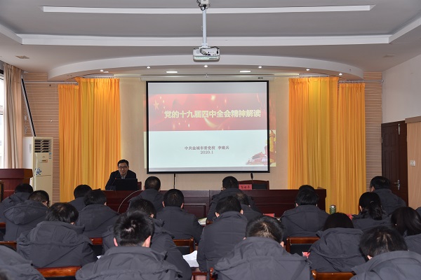盐城市委党校李建兵教授在会上作了《党的十九届四中全会精神解读》的专题辅导讲座,从全会概况与重大意义,社会主义制度的显著优势与制度自信,制度建设的总体要求、总体目标与重点任务,贯彻落实好全会精神等四个方面对全会精神作了深刻阐述,为公司贯彻落实好党的十九届四中全会精神,提供了重要的理论方向。