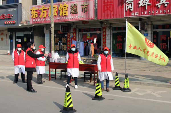 下午2时,8名医务专业人才志愿者,身穿医务工作服,头戴志愿帽,手提医药箱,在专业人才志愿服务队队旗的引导下,分两组进行卡口防控,主要任务是对进入卡口点的车辆人员进行停车询问、测量体温、下车登记,对个别司机口罩戴得不规范的进行了指导,对未戴口罩的进行宣传教育并发给医用口罩,对外地车辆及人员禁止入内。经过2个多小时的志愿服务,两处卡口点共登记173辆场内车辆,197人。经测量,正常体温197人。拒绝外地车辆入内9辆.