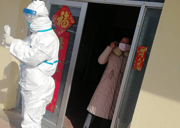 (图为金湖县疾控中心医务人员上门做核酸体检)