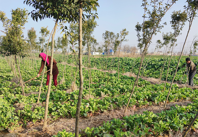 淮海农场境内有面积较大的林地面积,并且苗木长势较好,成为农场生态林地发展的一景。林木的发展,利益于农场采取的集体林、股份林和承租林三种管理模式,因股份林和承租林一般由职工管理的林下经济发展的较好外,昨天下午,我们来到农场五分场社区集体管护的林地间看到,其林下林边的油菜、蚕豆等矮杆农作物长势正旺,农业职工正在林下进行锄草等农事活动,给这个新春增添了一道忙碌的风景。