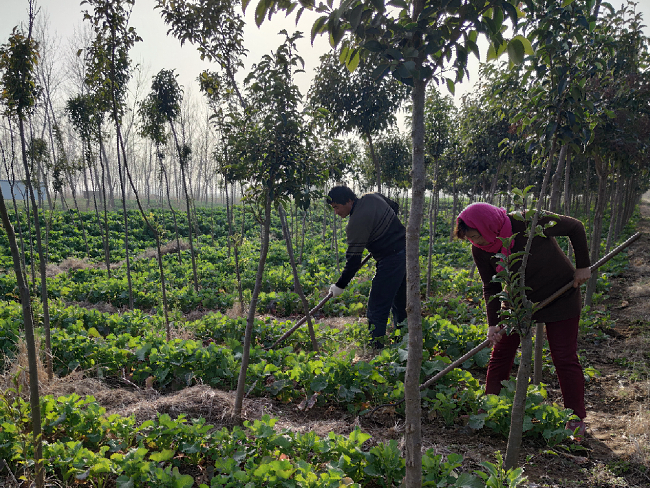 淮海在林地管理中,鼓励职工把精力投入到林下土地的套种增收上,走出了一条林地护林增收的新途径。图为农户在林下对油菜蚕豆田进行锄草时的镜头。