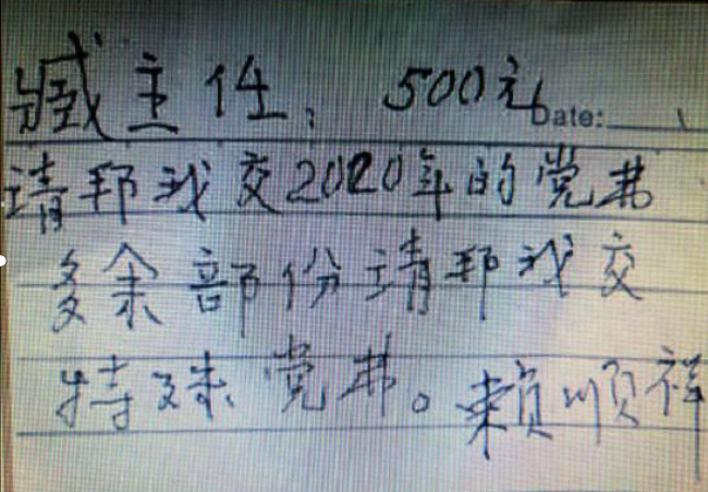 赖顺祥今年90高龄,1979年加入中国共产党,是城西党支部一名普通的老党员,十年前老伴去世,一直随儿女在镇江丹徒生活至今。这么多年了,赖老每年的党费都是通过QQ转账或微信转账提前缴纳。老人虽然年事已高,但每天坚持收看《新闻联播》,当得知全国新型冠状病毒肺炎疫情的严峻形势后,一心想为国家做些什么。特委托儿媳通过微信转账向城西党支部缴纳了500元党费,同时还注明除一年该交纳的党费外,其余部分均作为疫情防控特殊党费进行交纳。图为赖顺祥与臧成龙微信聊天截图。