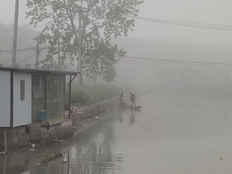 淮海农场有限公司因为与农村插花而居的现象,许多河道流经农场和农村,为了对这些河道的有序管理,农场和农村通过责任界定,对各个流经分管区域的河道加强水资源保护,全面落实最严格水资源管理制度,严守“三条红线”。同时还加强河道水域岸线管理保护,加强水污染防治,统筹水上、岸上污染治理,排查入河污染源,优化入河排污口布局。通过加大黑臭水体治理力度,确保流经农场农村的河道实现环境整洁优美、水清岸绿。图为位于农场一侧的六垛居委会的管护者,在浓雾中用船在清理风雨后飘落在河面上的垃圾。
