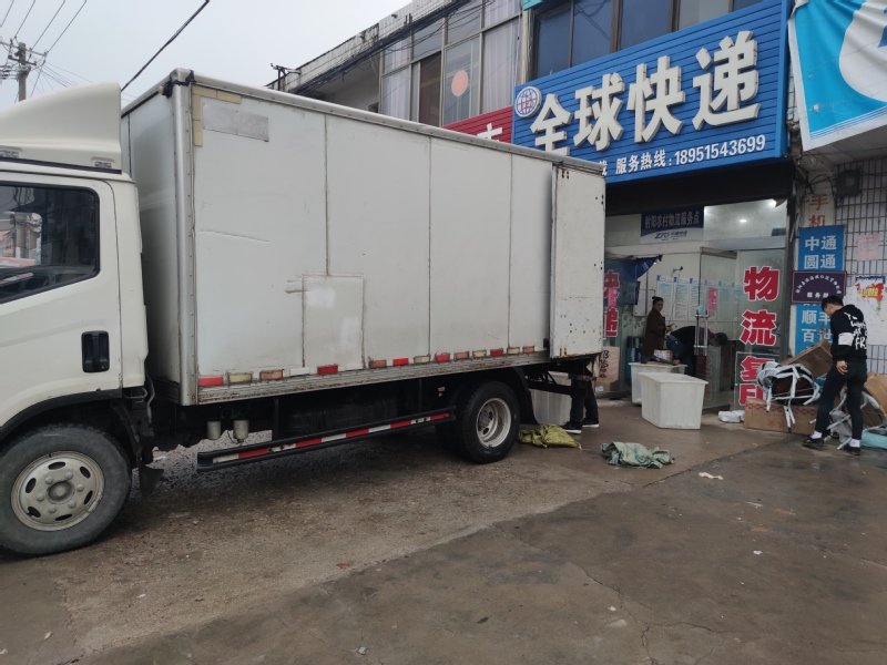 5月8日傍晚,一车厢式货车停靠在农场全球快递的门前,只见五六名快递员麻利地拿着五六个大口的塑料桶,把送货员传送下来的物品装到桶内,再拉到分检店内扫码编号,整个过程忙而有序。