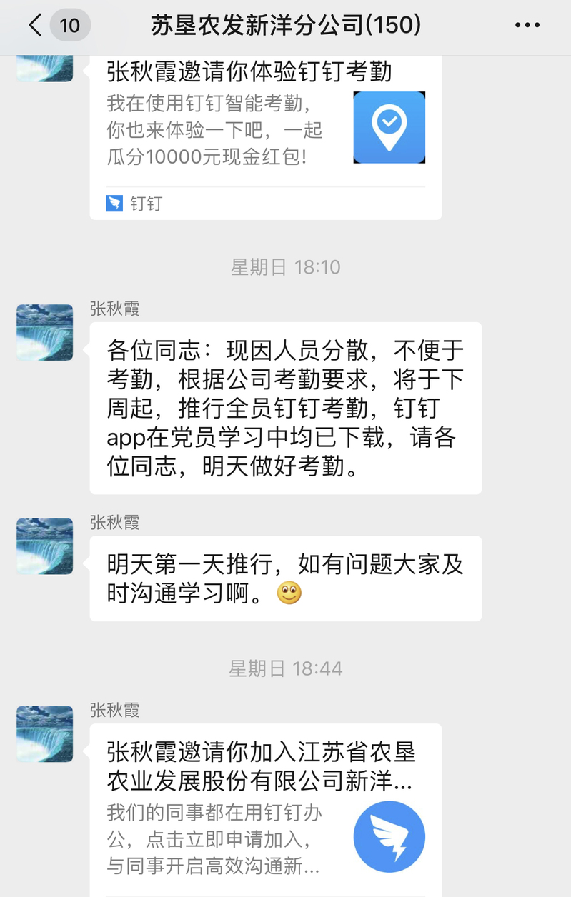 “‘三夏’大忙期间因人员分散,不便于考勤,根据公司要求,下周起推行全员‘钉钉’考勤,请各位同志积极做好考勤工作。”近日,苏垦农发新洋分公司微信工作群内发布了一则关于加强“钉钉”考勤的通知。