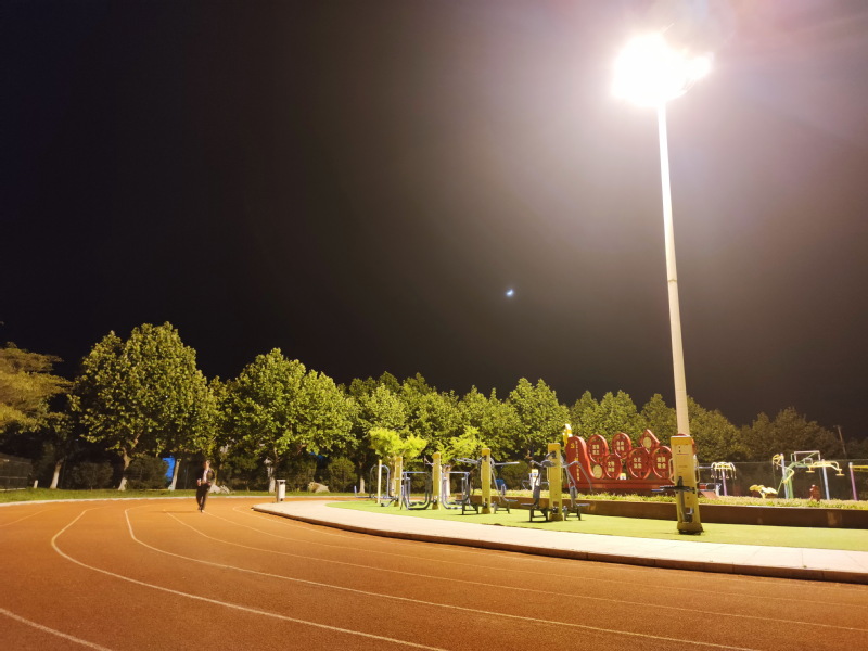 农场人的作息时间与城里人不同,与广场上夜幕刚降临的热闹相比,当时间过上夜间9点时分,同样在职工休闲体育运动广场内却很难看到人了,他们回家坐上床上美美地看着电视,或是早早地沉浸梦乡,把一天的行程收纳。而此时如果你还走在广场上,就可享受着广场内少有的宁静和静谧时刻。静逸的舞蹈池犹如一面水的池塘,倒映着健身器材和景观灯,为美丽的夜色增添新的美景。广场内的各种健身器材此时全部静了下来,在光影下显得格外壮美。栅栏上“发展体育运动 增强人民体质”的红色立体字型,红得更艳,在夜色中别有一番风致。降红色的塑胶跑道齐齐整整,与周边浓密而又青绿摇曳的梧桐树相得益彰,如诗如画和一动一静的完美结合,给人以非常地亮眼。