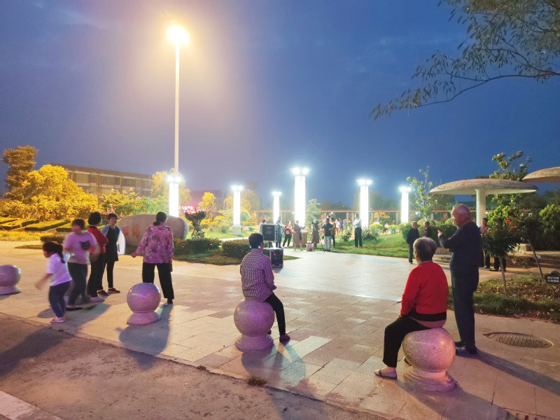 随着夏季的来临,每当人们吃完晚饭,在淮海农场淮海公园内就是别样的风景。这时晚霞余辉西下,夜幕降临,公园内变幻的灯光闪烁,色彩斑斓,让公园内的绿植、设施和灯光融合在一起,非常漂亮。