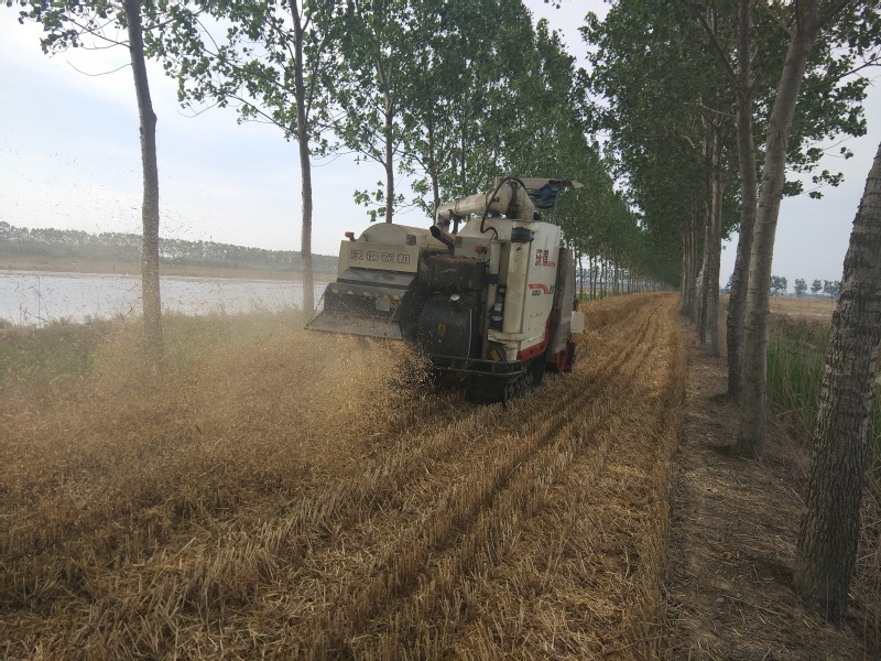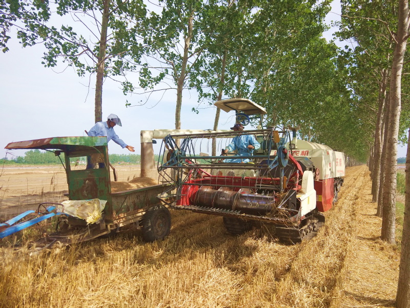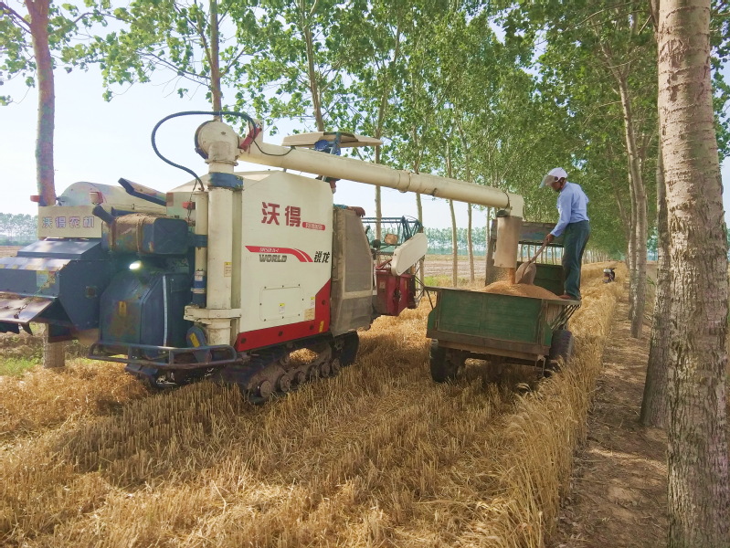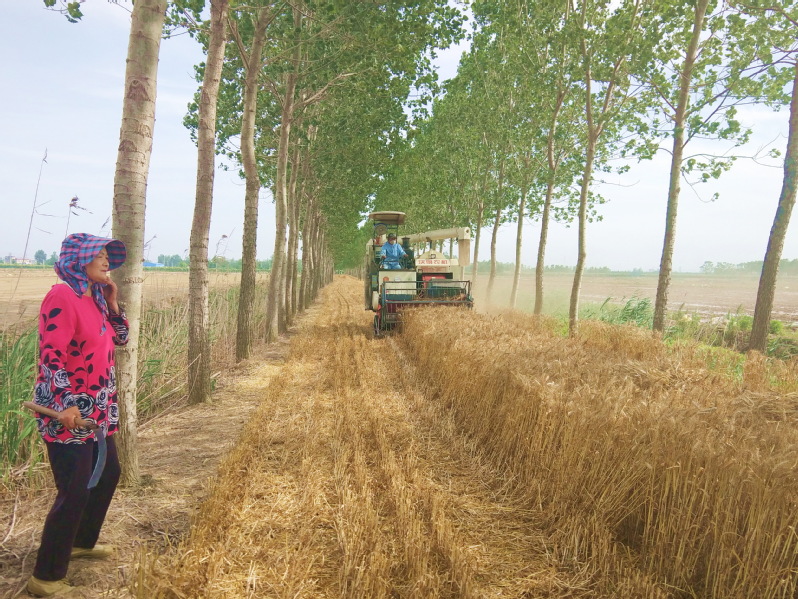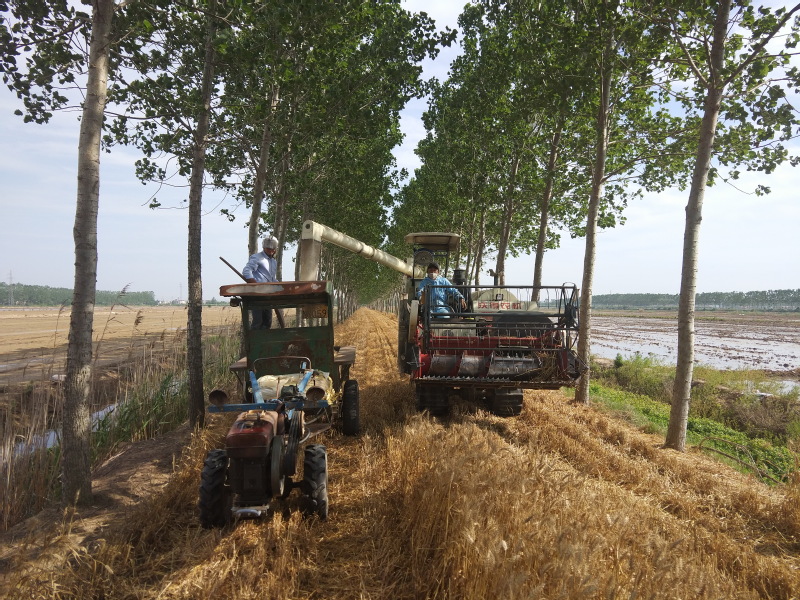 淮海农场有限公司区域内的林地资源十分丰富,农场公司的境内除路边林、河边林外,还有数千亩位于田头的堆堤林和田间的防风林,对于这些较为宽阔的林地,为便于务林职工在林地间以耕代扶,农场公司的林业从业人员对这些林地进行平整,并通过大规格树木的规划建设,以方便机械化作业,保证农工在栽植好树苗的同时,林间还有充足的宽度保证耕耙播和小型收割机械进行林间作业,这一举措在充分发挥林地的产能和效益的同时,也大大减轻了林业从业人员的劳动强度,让人们从繁重的体力劳动中解放出来,从而大大提升了农业职工务林的积极性,提升了种林的热情,从而实现了农场职工轻松种粮的梦想。图为淮海农场有限公司五分场社区张为民承租的林下小麦成熟时的镜头。