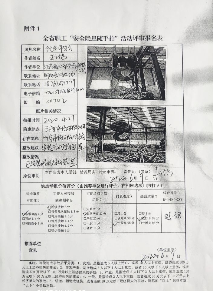 为减少职业危害,发挥广大职工安全生产行为主体积极作用,三河农场工会近日开展安全隐患随手拍活动。职工利用手机对本单位工作场所存在的各种事故隐患进行拍照,提交给工会和安全管理部门,由企业安全管理部门进行核实,甄别,评估并组织整改,从而形成人人查隐患,人人反违章,人人保安全的安全生产浓烈氛围。
