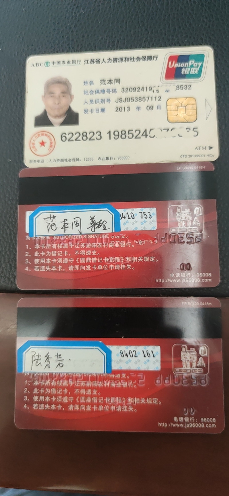对刘军兵的善举,我们表示了肯定,于是立即就把这三张卡拍了照,上传至淮海农场管理人员工作群中,并注明请认识丢失卡的同志进行转告。迅即,二分场干事魏玉春看到信息后,就有了回应,说丢失卡的人是他们二分场社区的,已经通知老人的儿子前来认领。