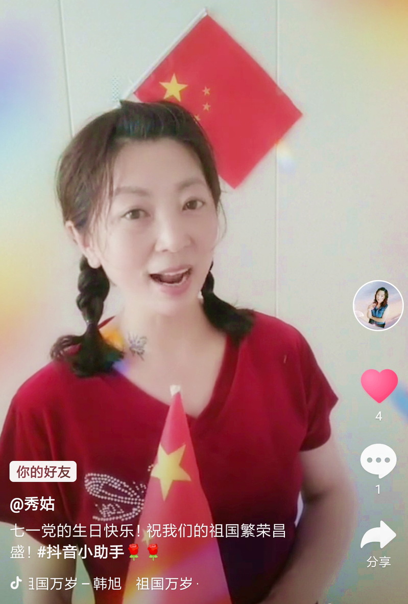 我们在一个抖音名叫秀姑的抖音视频上看到,她以身着红衣裳,在家中通过墙面置放国旗、手挥国旗,并以歌唱《祖国万岁》的歌曲形式,在七一党的生日这天,运用新颖喜庆的表现手法,引人入目的视听享受,向党的99周岁生日献上一个普通社区居民真挚的祝福和对党的忠贞不渝的敬爱之情。